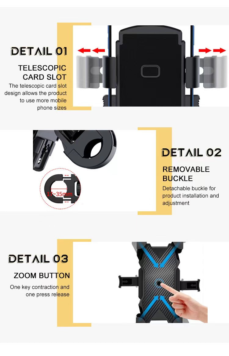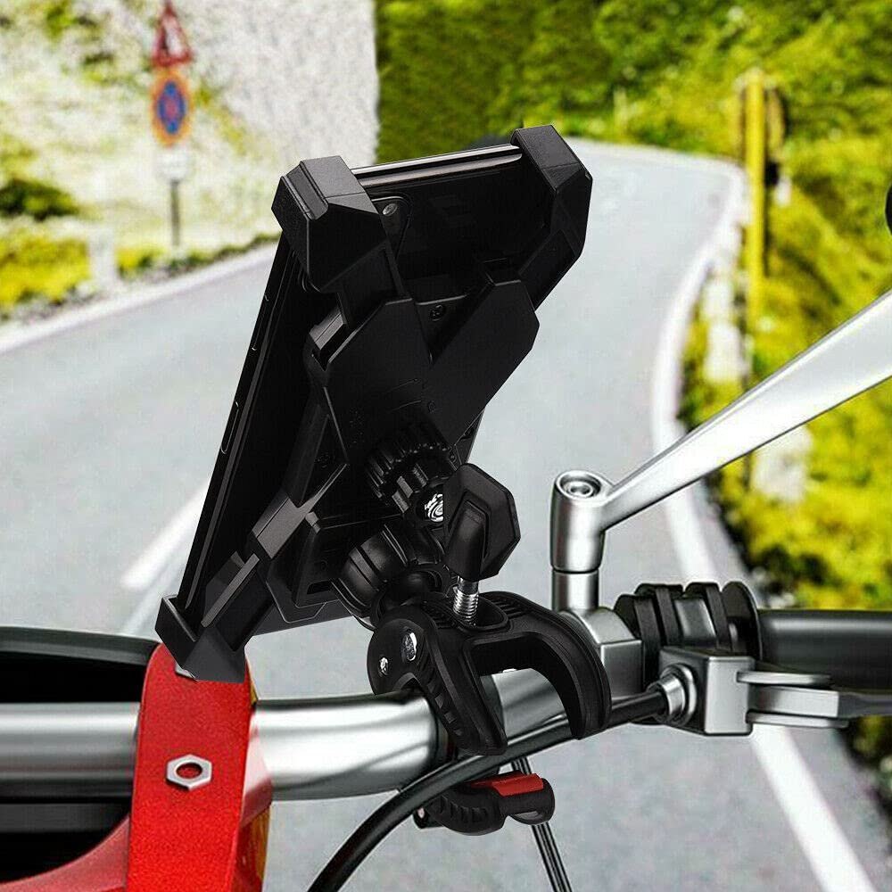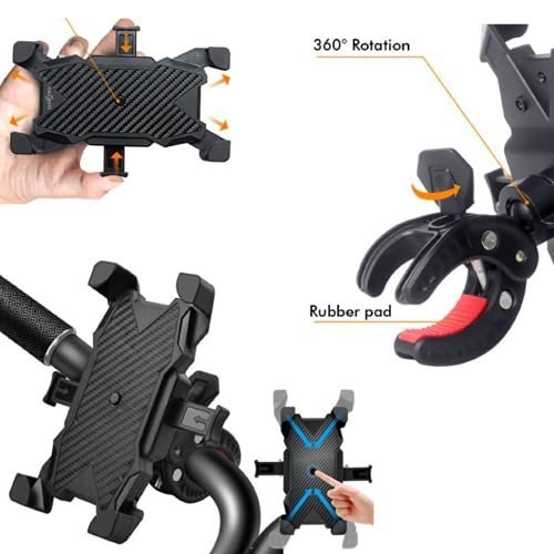 حامل هاتف محمول 360 درجة للدراجات النارية، حامل متين وآمن مع 4 زوايا لتأمين هاتفك لضمان بقاء هاتفك متصلاً بشكل آمن في دراجتك، سهل ضبط أفضل زاوية عرض على المقود مع دوران 360 درجة، وصول آمن للهاتف بدون استخدام اليدين على الطريق، تصميم مثالي: تجنب الضغط على مفتاح الصوت ومفتاح الطاقة بشكل متكرر مثل الموديلات الأخرى، التوافق العالمي: يعمل مع أي هاتف ذكي يصل إلى 6.8 بوصة، سهل التركيب والإزالة بسهولة في أي وقت.